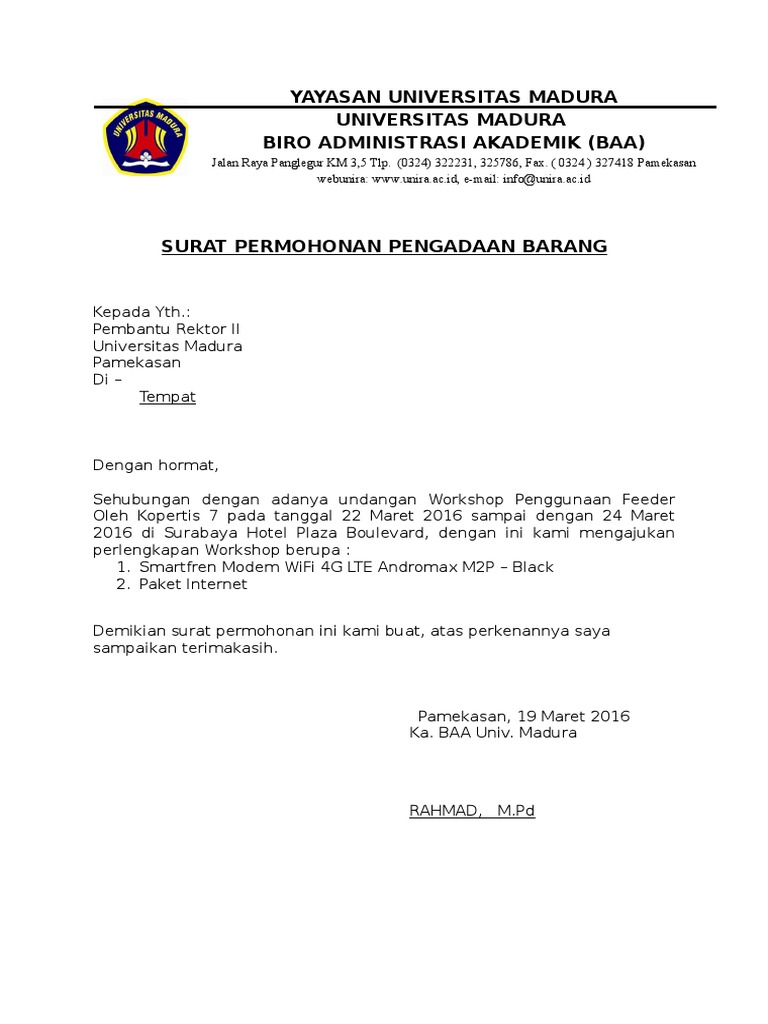 Contoh surat pengajuan atau permintaan dana. Secara resmi pihak tertentu, ✅ anda membutuhkan ? Kumpulan contoh surat permohonan untuk kerjasama, rekomendasi, bantuan dana, permohonan maaf, beasiswa atau keperluan yang lain dengan penulisan yang baik dan benar. Contoh surat permohonan yang benar dan benar. Contoh surat permohonan maaf dalam bahasa inggris. Permohonan pengadaan barang lampiran : Surat permohonan adalah salah satu surat resmi yang berisi permintaan tentang suatu hal kepada pihak lain. Jika hendak membuat surat ini, tentu anda harus memakai bahasa yang sopan sesuai. Contoh surat permohonan untuk izin, kerjasama, barang, dana dan lain sebagainya bisa digunakan sebagai surat pendukung dalam kegiatan memohon kepada pihak terkait. Surat permohonan ✅ merupakan surat yang berisi permohonan ? Contoh surat permintaan barang merupakan surat yang dikirimkan oleh pembeli kepada penjual no :